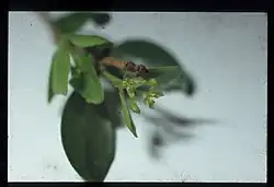 The species, Tupeia antarctica (common names - tāpia, kohuorangi, pirinoa, piritia, white mistletoe),[5] is a Diecious[6] mistletoe which grows up to 1m wide. Its bark is white, and the twigs are finely hairy. The leaves are variously shaped, fleshy, bright green and from 10 to 70 mm long. The flowers are tiny and the fruit is white to pinkish.[7]