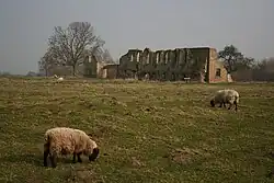 By 1700 the style of the Tudor mansion was deemed unfashionable and the Vyners proceeded to demolish it, building in the classical style a new house called Tupholme Hall (demolished 1976), located some 750 metres north-east of the abbey site. They cleared away the old house, but retained the one surviving wall of the medieval abbey as an eye-catching feature, a fashionable ornament in their surrounding landscaped parkland.[4] Despite these developments, in the 1730s the Vyners moved to yet another house in the possession of their family, Gautby Hall, and let Tupholme to tenants. In the 18th century, a farmyard developed around the site of the remaining wall. By the start of the 20th century this had become a busy farmstead, but by the middle of that century it had declined and the site was used only for labourers' housing, by the 1970s becoming empty and derelict and despite attempts to save it, was demolished in 1984.
