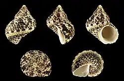 Turbo bruneus, commonly named the brown (Pacific) dwarf turban or the little burnt turbo, is a species of sea snail, marine gastropod mollusk in the family Turbinidae.[1] These snails are called "turbo" because they can move quite quickly for a snail, using a muscular foot to glide along the ocean floor. They feed on algae and other small organisms that they scrape off rocks and other surfaces.