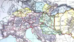 The Turcilingi are generally considered to have been a Germanic tribe.[8][9] By one 19th century account, the Turcilingi appear to have originated in Germany, perhaps near the Baltic Sea,[10] and thence moved with the Huns into Gaul and finally to the Danube, possibly Noricum, before entering Italy with Odoacer. It was often assumed that they were an Eastern Germanic people related to the Sciri, or at least connected to the Sciri by special affinity.[11] Nineteenth-century German scholarship thus supposed that the Turcilingi were neighbours of (or the same people as) the Sciri in the first century, or that they were the royal clan of the Sciri[12] or the Huns. The more enthusiastic invented a homeland for them straddling the Oder, with the Sciri to the east, the Vandals to the west, and the Rugii to the north. These scholars placed them in the Gothic mouvance.