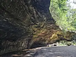 The major features of the park are formed from erosion in Mansfield sandstone from the Mansfield formation.[12] This formation was deposited during the Carboniferous period at the mouth of the ancient riverbed, where sediments collected and compacted. This swampy environment formed coal deposits that were mined in the late 19th and early 20th centuries. A collapsed entrance to a coal mine is still a major feature of the park.[13]