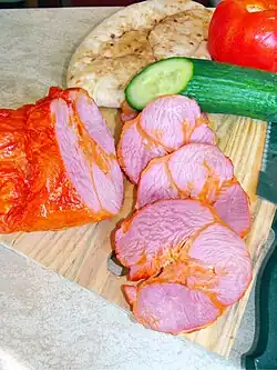Turkey ham is a processed meat product made primarily from cooked or cured turkey meat and water, formed into the shape of a ham and often sold pre-sliced.[1][2] It is a ready-to-eat product that can be consumed cold or heated.[3]