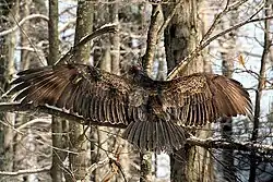 This vulture is often seen standing in a spread-winged or horaltic stance. The stance is believed to serve multiple functions: drying the wings, warming the body, and baking off bacteria. It is practiced more often following damp or rainy nights. This same behavior is displayed by other New World vultures, by Old World vultures, and by storks.[6] Like storks, the turkey vulture often defecates on its own legs, using the evaporation of the water in the feces and/or urine to cool itself, a process known as urohidrosis.[55] It cools the blood vessels in the unfeathered tarsi and feet, and causes white uric acid to streak the legs.[56] The turkey vulture has few natural predators and the few recorded predators appear to take them quite infrequently. Fledging, immature and adult vultures, in descending likelihood of predation, may fall prey to great horned owls, golden eagles, bald eagles and potentially red-tailed hawks, while eggs and nestlings may be preyed on by mammals such as raccoons and opossums.[6][28][57][58][59] Foxes can occasionally ambush an adult, but species that can climb are more likely to breach and predate nests than adults, while dogs may sometimes kill a turkey vulture as well.[60] Its primary form of defense is regurgitating semi-digested meat, a foul-smelling substance, which deters most creatures intent on raiding a vulture nest.[5] It will also sting if the predator is close enough to get the vomit in its face or eyes. In some cases, the vulture must rid its crop of a heavy, undigested meal to take flight to flee from a potential predator.[35] Its life expectancy in the wild ranges upward of 16 years, with a captive life span of over 45 years being possible.[61][62][63]