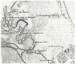 The camp was located on the Volokolamsk Road on a hill outside the village of Tushino. It was located between the Skhodnya and Moskva Rivers, in the place where the Skhodnya flows into the Moskva River. The camp was located on a high hill from which the territory was visible for several miles in the direction of Moscow. The hill was surrounded by cliffs to the north, east, and south. To the west the camp was surrounded by an earthen rampart, the remains of which were visible at the beginning of the 20th century. In addition, wooden fortifications were built. The Cossack camp was separated from the main camp by the river. False Dmitry II lived in a palace built to the west of Tushino near the Spassky Monastery on the banks of the Moskva River. False Dmitry's palace was located on a hill surrounded by a rampart and a moat. The hill was later given the name received the name "Tsarikova Gora", which remained in use until the beginning of the 20th century.[1]
