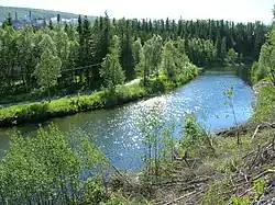 The Svenskvegen bridge connecting the European route E6 highway to the village of Gruben to the east marks a name change on the bridge. South of the bridge this river is the Tverråga, but the remaining section of the river to the north of the bridge is called the river Revelelva. The 800-metre (2,600 ft) long Revelelva then flows into the river Ranelva.[2]