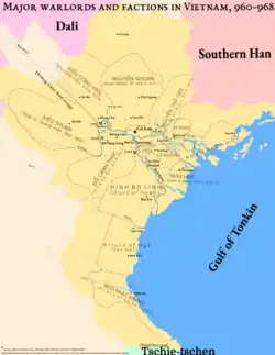 The Anarchy of the 12 Warlords[1] (Vietnamese: Loạn 12 sứ quân, chữ Nôm: 亂𨑮𠄩使君; Sino-Vietnamese: Thập nhị sứ quân chi loạn, chữ Hán: 十二使君之亂), also the Period of the 12 Warlords,[2] was a period of chaos and civil war in the history of Vietnam, from 965 to 968 caused by the succession of the Ngô dynasty after the death of King Ngô Quyền. This period is also sometimes simply called the Twelve Warlords[3] (Vietnamese: Mười hai sứ quân, 𨑮𠄩使君). Four of the warlords are verified to have traced their direct lineage from what is now China today. This period ended in 968 with the unification war of Vietnam by Đinh Bộ Lĩnh, who later established the Đinh dynasty.