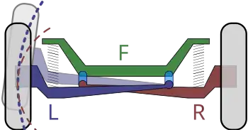 Another use of the swing axle concept is Ford's "Twin I-Beam" front suspension for trucks. This system has solid axles, and may transmit power in four-wheel-drive versions, where it is called "Twin Traction Beam". It is an independent suspension system, as each tyre rises and falls without affecting the position of the other. Although each tyre still moves in an arc as in a standard swing-axle suspension, the lower control arms are effectively lengthened by attaching the axle pivot point to the bottom of the opposite frame rail (i.e., the left lower control arm pivots on the right frame rail and vice versa). The lowered pivot point and longer arm length reduce the change in camber and the effect is far less hazardous than powered swing axles for the rear wheels listed above, where the pivot point is approximately on the same side frame rail.[6] The Twin I-Beam suspension includes an additional radius arm link on each side to control caster.[7]