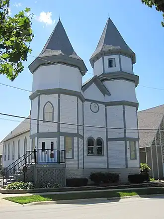 Twin Tower Sanctuary (Old Sanctuary of the United Methodist Church) is a historic Methodist church building at 9967 W. 144th Street in Orland Park, Illinois. The church was completed in 1898, six years after Orland Park was founded, to serve the city's large Methodist population. Architect William Arthur Bennet, who later became well known for his Prairie School works, designed the church in the Queen Anne style. The north side of the church is flanked by the two hexagonal towers that give the church its name. The interior of the church has a Sullivanesque patterned tin ceiling; according to Louis Sullivan scholar Tim Samuelson, it is the best-preserved example of a Sullivanesque tin ceiling in the country.[2]