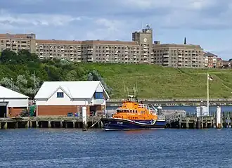 After some years with the motor lifeboat moored afloat, the RNLI took over a boathouse belonging to the War-office in 1921. It was located right next to the Tyne Lifeboat Society boathouse at Clifford's Fort. The lifeboat was mounted on a trolley, which could be winched up or down a trolley-way. In 1941, bombs dropped in a war-time air-raid destroyed the Tyne Lifeboat house, containing the James Young lifeboat, and the RNLI boathouse, containing the John Pymont (ON 824).[9] A replacement boathouse and slipway would be constructed at the same location in 1947.