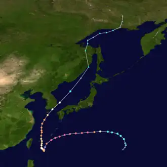 The system re-strengthened again to Category 3-equivalent typhoon as it strengthened, with deep convection becoming more symmetric on September 4.[34] Multispectral animated satellite imagery revealed a 10 nautical miles (19 km; 12 mi) surrounded eye around a spiral banding.[35] Hinnamnor continued to be persistent despite dry air intrusion from the west.[36] Its eye slowly became cloud-filled as its circulation wrapped around it.[37] At 21:00 UTC on September 5, the JTWC further downgraded it to a Category 2-equivalent typhoon.[38] According to the Korea Meteorological Administration (KMA), Hinnamnor made landfall just southeast of Geoje, South Gyeongsang Province, South Korea.[39] At 03:00 UTC the next day, the JTWC issued their final warning on the system as it began its transition into an extratropical cyclone, with its frontal structure.[40] Shortly after, the JMA downgraded Hinnamnor to a severe tropical storm.[41] The JMA issued its last advisory on Hinnamnor, and declared it an extratropical low.[42] The low moved northward and was last noted in Okhotsk, Russia on September 7.[43][44]
