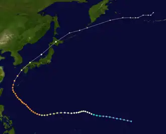 Typhoon Mireille, known in the Philippines as Super Typhoon Rosing, was the costliest typhoon on record, until it was surpassed by Typhoon Doksuri in 2023.[1] Striking Japan in September 1991, it became the 20th named storm of the 1991 Pacific typhoon season, Mireille formed on September 13 from the monsoon trough near the Marshall Islands. It moved westward for several days as a small system, steered by the subtropical ridge to the north. The storm rapidly intensified to typhoon status on September 16, and several days later passed north of Saipan in the Northern Marianas Islands. Mireille intensified further after deleterious effects from a nearby tropical storm subsided. On September 22, the American-based Joint Typhoon Warning Center (JTWC) estimated maximum 1-minute sustained winds of 240 km/h (150 mph), and on the next day, the official Japan Meteorological Agency (JMA) estimated 10‑minute sustained winds of 185 km/h (115 mph). The typhoon weakened slightly while turning northward, passing just east of Miyako-jima and later to the west of Okinawa. On September 27, Mireille made landfall near Nagasaki in southwestern Japan with winds of 175 km/h (109 mph), the strongest since Typhoon Nancy in 1961. The storm accelerated to the northeast through the Sea of Japan, moving over Hokkaido before becoming extratropical on September 28. The remnants of Mireille continued to the east, passing through the Aleutian Islands of Alaska on October 1.