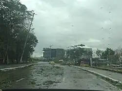 Following the closure of maritime seaports, more than 100 passengers were reportedly stranded at the Port of Batangas, along with 39 rolling cargoes. Meanwhile, at least 841 passengers were stranded in five ports in the Bicol region, namely Matnog, Tabaco, Bulan, Cataingan and Pilar.[11] A total 50 flights were cancelled and over 100 thousand families were evacuated as the typhoon neared landfall.[12][13] The Philippine Department of Health said that they have prepared all government hospitals to aid the rescue and relief process during and after the typhoon. They claimed that they are much better prepared now, than they were for earlier typhoons.[14] Ahead of the landfall, a city in the province of Albay had declared a state of calamity.[15] At around 17:00 Philippine Standard Time (09:00 UTC), Rammasun's eye passed directly over Rapu-Rapu, Albay while the storm was at its initial peak intensity.[16] Various parts of the National Capital Region reported power outages during the storm. They were reportedly caused by "a temporary system balance at 1:29 a.m. due to a sudden plant outage."[17] Laguna is one of the badly hit by the typhoon[18] At least 6,000 people were stranded at various seaports throughout the country due to the storm.[19]