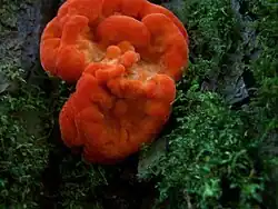The fruit bodies of Tyromyces pulcherrimus are bracket-shaped caps that measure 3–8 cm (1.2–3.1 in) in diameter. They are sessile, lacking a stipe, and are instead attached directly to the substrate. The cap colour when fresh is cherry red or salmon, but it dries to become brownish. The cap surface can be hairy, particularly near the point of attachment. Pores on the cap underside are red, and number about 1–3 per millimetre. The flesh is soft and thick, red, and watery. It does not have any distinct odour.[6] Tyromyces pulcherrimus is inedible.[5]