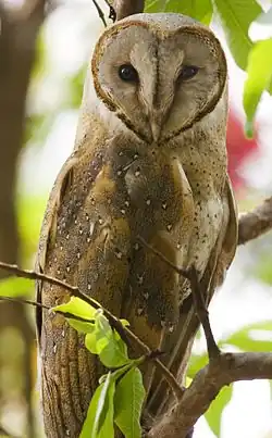 The eastern barn owl (Tyto javanica) is usually considered a subspecies group and together with the American barn owl group, the western barn owl group, and sometimes the Andaman masked owl make up the genus Tyto. The cosmopolitan barn owl is recognized by most taxonomic authorities. A few (including the International Ornithologists' Union) separate them into distinct species, as is done here. The eastern barn owl is native to southeastern Asia New Zealand and Australasia.