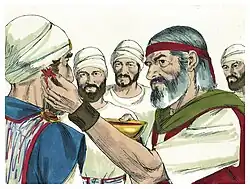 Tzav, Tsav, Zav, Sav, or Ṣaw (צַו—Hebrew for "command," the sixth word, and the first distinctive word, in the parashah) is the 25th weekly Torah portion (פָּרָשָׁה, parashah) in the annual Jewish cycle of Torah reading and the second in the Book of Leviticus. The parashah teaches how the priests performed the sacrifices and describes the ordination of Aaron and his sons. The parashah constitutes Leviticus 6:1–8:36. The parashah is made up of 5,096 Hebrew letters, 1,353 Hebrew words, 97 verses, and 170 lines in a Torah scroll (סֵפֶר תּוֹרָה, Sefer Torah).[1] Jews read it the 24th or 25th Sabbath after Simchat Torah, generally in the second half of March or the first half of April.[2]