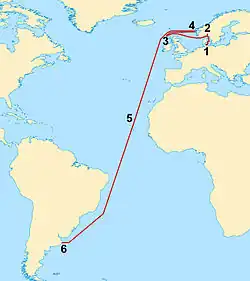 Schäffer said that, after the short Cape Verde break, they completed the rest of the trip to Mar del Plata alternately on the surface and submerged.[3]
