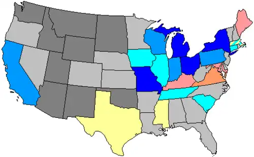 Following the 1880 census, 32 new seats were apportioned.[5] Three States lost 1 seat each, 13 States had no change in apportionment, 14 States gained 1 seat each, 6 States gained 2 seats, 1 State gained 4 seats, and 1 State gained 5 seats. Several States that gained one or more seats did not redistrict immediately, electing the new members at-large, while one state (Maine) which lost a member also delayed redistricting, electing all of its members at-large for this Congress only.