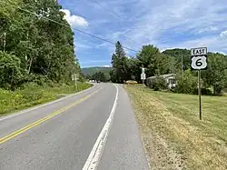 After passing Warren, US 6 reaches an intersection with the western terminus of PA 59, which heads east to follow the Allegheny River. From here, the route continues southeast into the Allegheny National Forest, winding to the south parallel to a Buffalo and Pittsburgh Railroad line as it enters mountainous terrain. US 6 passes southeast through developed areas of the borough of Clarendon along North Main and South Main streets. Past here, the road heads south-southeast through more of the national forest, with occasional development along the road. In the community of Sheffield, the route comes to an intersection with the eastern terminus of PA 666 and curves to the east. US 6 continues through rugged forests and heads northeast before making a turn to the southeast.[1][7]