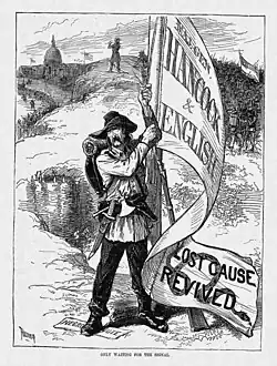 The gold standard and the tariff tax on imports divided the major parties.[5] The monetary debate was over the basis for the value of the United States dollar. Nothing but gold and silver coin had ever been legal tender in the United States until the Civil War, when the mounting costs of the war forced the United States Congress to issue "greenbacks" (dollar bills backed by government bonds).[6] Greenbacks helped pay for the war, but resulted in severe inflation .[6] After the war, bondholders and other creditors (based in the North) wanted to return to a gold standard. At the same time, debtors (especially in the South and West) benefited from the way inflation reduced the real value of their debts, and workers and some businessmen liked the way inflation made for easy credit.[7] The issue cut across parties, producing dissension among Republicans and Democrats alike and spawning a third party, the Greenback Party, in 1876, when both major parties nominated "hard money" candidates (i.e., candidates who favored the gold-backed currency instead of "soft money" greenbacks that generated inflation). Monetary debate intensified as Congress effectively demonetized silver in 1873 and began redeeming greenbacks in gold by 1879, while limiting their circulation.[8] As the 1880 election season began, the nation's money was backed by gold alone, but the issue was far from settled.[9]