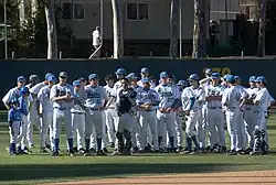 The Bruins baseball team gathering in the outfield at Jackie Robinson Stadium in 2007