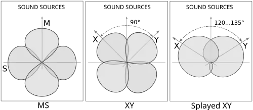 - XY (later the Blumlein pair[48]): left (X) and right (Y) channel microphones are placed at −45° and 45° to the direction the center of the soundstage[46][48]