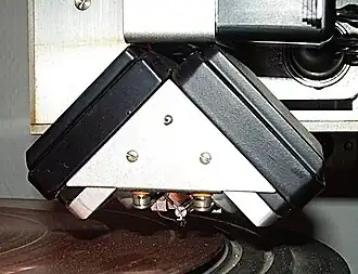 Patent 394325 put forward a third proposition: the single cutter should be driven by two orthogonal actuators, placed at 45° and −45° to the surface of the disc.[53] Polarities of electrical L and R signals that drive the actuators must be chosen in such a way that the lateral movement of the cutter corresponds to monaural signal M, and vertical movement corresponds to the difference between two stereo channels, S.[53] This ensures backward compatibility with traditional monaural pick-ups of the most common, lateral-cut system.[53]