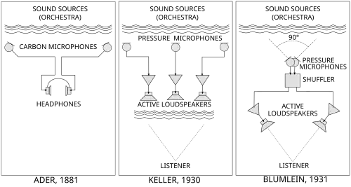Keller was primarily interested in amplified public address sound; he placed arrays of microphones on the stage and transmitted parallel audio signals to arrays of amplified loudspeakers in a remote listening hall, trying to capture and recreate the original "sound front".[1][17] Best results were obtained with expensive two-dimensional arrays, capable of recreating both width and depth of the original; linear (one-dimensional) arrays could produce almost perfect sense of width, but not depth.[1] The minimal working configuration required three channels (left, centre and right).[1] It was adequate for recreating width, and even a limited sense of depth, but only for the listeners sitting close to the axis of the centre channel,[1] and too expensive for the consumer market.[18] A cheaper two-channel stereo setup could not reproduce the sound field; the sound inevitably broke up into left and right point sources with a "hole in the middle".[18]