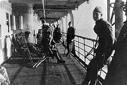 After her requisition by the U.S. government, Havana was turned over to the United States Army on 24 May 1917 for service as a transport ship.[7] She was hastily outfitted for trooping duties, and at daybreak on 14 June, USAT Havana, with fellow Army transport ships Saratoga, Tenadores, and Pastores, accompanied by cruisers Seattle, DeKalb, destroyers Wilkes, Terry, Roe, and converted yacht Corsair, set out from Ambrose Light for Brest, France. They were in the lead group of the first American troop convoy to France during World War I.[7][8] Corsair was unable to maintain the 15 kn (17 mph; 28 km/h) pace and fell back, being replaced by destroyer Fanning from the second group.[9]