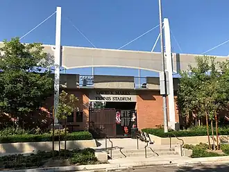 The Uytengsu Aquatics Center (originally the McDonald's Olympic Swim Stadium) is an outdoor aquatics venue located on the campus of the University of Southern California in Los Angeles, US.[50] The facility features two pools: a long course pool (50x25 meters), and a diving well (25x25 yards), with towers.[51] The facility is the home pool for the USC Trojans swimming and diving teams.