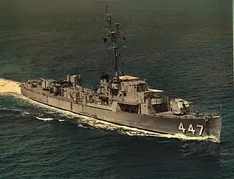USS Albert T. Harris (DE-447) was a John C. Butler-class destroyer escort acquired by the U.S. Navy during World War II. The primary purpose of the destroyer escort was to escort and protect ships in convoy, in addition to other tasks as assigned, such as patrol or radar picket. Post-war she returned home with two battle stars to her credit.