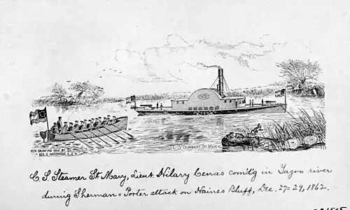 St. Mary—a small, wooden-hulled, side-wheel steamer built at Plaquemine, Louisiana—was presented to the Confederate government upon completion early in 1862. Protected by bales of cotton, the vessel operated on the Yazoo and Tallahatchie Rivers for the remainder of that year and into the summer of 1863. On 13 July, a Union joint Army-Navy expedition of four warships and 5,000 troops captured St. Mary at Yazoo City, Mississippi.