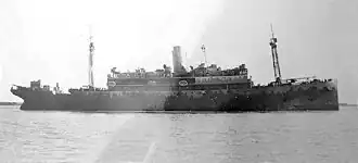 Jamaica was delivered to the War Shipping Administration (WSA) on 24 March 1942 at New Orleans under bareboat charter.[14] Todd Pacific Shipyards of Galveston, Texas converted her for Navy use. She was renamed USS Ariel and commissioned at Galveston on 14 May 1942 with Captain E.P. Hylant as her commander.[15]