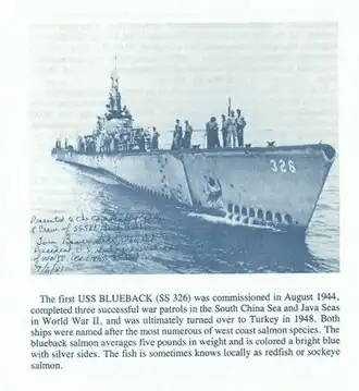 ![]() Excerpt from the decommissioning booklet of the second USS Blueback (SS-581) describing the first USS Blueback (SS-326). The booklet was printed and distributed by the U.S. Navy. | |