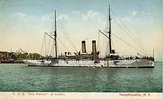 Des Moines was launched on 20 September 1902 at the Fore River Ship and Engine Company, Quincy, Massachusetts, sponsored by Miss Elsie Macomber; and commissioned on 5 March 1904.[4]