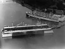 Dewey was put into service in the U.S. Naval Base Subic Bay at Olongapo and remained active through World War I and the interwar years. Dewey sank 24 May 1910 while receiving a torpedo boat[2] but was raised undamaged on 29 June and put back in service.[3] After the outbreak of World War II, Dewey was moved to Mariveles, Bataan, when the U.S. forces retreated to that peninsula. As the reality of the situation of the U.S. forces became apparent, several undamaged ships, including Dewey, were ordered scuttled to prevent them from falling into the hands of the Japanese. On 8 April 1942, Dewey's docking officer, Lt. C. J. Weschler, scuttled the drydock.[4][5] Three damaged ships were also scuttled with Dewey during the Battle of Bataan; the submarine tender Canopus and the minesweeper Bittern[6] and the tugboat Napa.