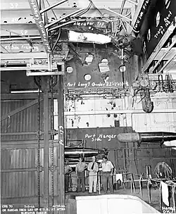 One 5 in (127 mm)/38 caliber dual-purpose gun was mounted on the stern. Anti-aircraft defense was provided by eight Bofors 40 mm (1.6 in) anti-aircraft guns in single mounts, as well as twelve Oerlikon 20 mm (0.79 in) cannons, which were mounted around the perimeter of the deck.[6] By the end of the war, Casablanca-class carriers had been modified to carry thirty 20 mm (0.79 in) cannons, and the amount of Bofors 40 mm (1.6 in) guns had been doubled to sixteen, by putting them into twin mounts. These modifications were in response to increasing casualties due to kamikaze attacks. Casablanca-class escort carriers were designed to carry 27 aircraft, but the hangar deck could accommodate more. During the Mariana and Palau Islands campaign, the beginning of the Philippines campaign, and the Battle off Samar, she carried 16 FM-2 Wildcat fighters, and 12 TBM-1C Avenger torpedo bombers, for a total of 28 aircraft.[7] However, during the Battle of Okinawa, she carried 24 FM-2 fighters and 6 TBM-3 torpedo bombers for a total of 30 aircraft.[8]
