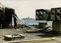 Fife's second overseas deployment began with "READIEX 83-4." Departing with the USS Ranger battlegroup on 15 July for the Persian Gulf, she alternated carrier escort duties with surveillance operations in the Gulf of Aden. While operating with the Ranger on 17 November, the Soviet guided missile frigate Razyashchiy approached the warships in what the US ships saw as a violation of international agreements for preventing collisions at sea. Fife suffered only minor damage from the resulting collision with Razyashchiy.[1] In December, Fife sailed south for a port visit in Mombassa, Kenya. While there, a cyclone passing over Agalega in the Mauritius Islands caused massive destruction. Fife, along with her SH-2F Seasprite helicopter, provided aid transferring food and water ashore. The Fife crew and the Helicopter Anti-Submarine Squadron, Light 37, Detachment 3 were awarded the Humanitarian Service Medal for their service in aid to the Agalaga inhabitants. During the return trip north, Fife intercepted the Soviet aircraft carrier Novorossiysk and performed a brief period of surveillance before rendezvousing again with the Ranger battlegroup. Relieved by the USS Midway battlegroup in January, the warships turned for home, arriving in San Diego on 29 February 1984.