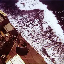 On 5 February 1971 Hanson, Dennis J. Buckley and Floyd B. Parks departed San Diego, for her fifth 6-month deployment to Vietnam. While about three days into the transit from San Diego to Pearl Harbor the three ships encountered a large floating buoy or pipe sealed on its ends floating upright, which was noticed on all three ships' radars as the sail of a surfaced submarine. On 12 February 1971, Hanson entered Pearl Harbor, just in time for a weekend stay. However, while Hanson was mooring, she closed faster than expected into her berthing space and struck Carpenter. First Div or deck crew was then obligated to paint over the scuffed paint of Carpenter's port side front hull and her bulwarks. Also Hanson's paint had to be tidied up on her starboard side. Hanson left Pearl Harbor, on 15 February, for Midway Island. A few days later Hanson, along with the rest of Desron 1, moored at Midway Island, refueled, and spent about four hours playing softball before heading to Guam. On 18 February 1971, while steaming between Midway Island and Guam, the three ships encounter a heavy typhoon creating 25-foot waves, sometimes reaching 70 feet. At crew's breakfast a Hanson crewman, who was on the signal bridge, was swept overboard. Another crew member, a port bridge lookout, just happened to see the man falling by the bridge wing window and he immediately sounded the alarm and threw a life ring into the sea where the man was floating. All three ships responded immediately but Hanson rescued him in less than 15 minutes. Hanson steamed on to Guam and released the rescued crew member to be sent to a hospital, refueled and continued her journey to Subic Bay.[4]