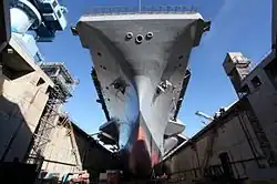On 28 February, the aircraft carrier began her dry-docking PIA maintenance and yard overhaul period at NNSY in Portsmouth (pictured).[42] During this maintenance cycle, Harry S. Truman received a new main mast, an upgrade in her close-in weapons systems, and the installation of the automated digital network system, which provides the carrier with enhanced communications and cooperative engagement capabilities to assess possible threats.[43] Harry S. Truman was expected to complete this DPIA yard overhaul in early 2012 and begin preparations for her sixth overseas deployment.[44] Also, her berthing spaces were also upgraded, installing 2,500 racks, replacing 46,000 square feet of deck and painting 106,000 square feet of spaces.[45]