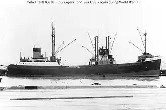 USS Kopara (AK-62/AG-50) was a cargo motor ship that was built in Scotland in 1938, spent much of its five-decade career in New Zealand ownership, and seems to have been scrapped in the 1980s. Between 1942 and 1945, Kopara served in the United States Navy, delivering supplies in the Pacific War. After the war, the US Navy returned her to her New Zealand owners, with whom she traded until 1966. From then until the late 1980s she passed through a series of owners in Papua New Guinea, Singapore, Malaysia and Thailand, who changed her name to Sarang, Cherry Chepat and finally See Hai Hong I.