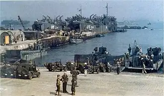 ![]() LST-374, starboard of LST-376, loads a DUKW amphibious truck at an unidentified English port prior to the Invasion of Normandy | |