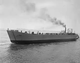 ![]() USS LST-446, launching at Kaiser Shipyards, Vancouver, Washington, 18 September 1942. The pilothouse and smoke stack belong to the paddle-wheel tug at the LSTs stern. | |