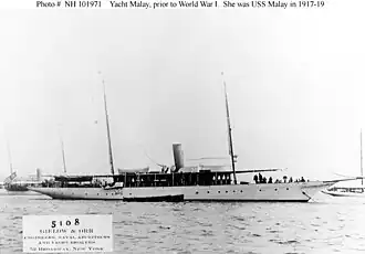 This article incorporates text from the public domain Dictionary of American Naval Fighting Ships. The entry can be found here.- Department of the Navy Naval History and Heritage Command Online Library of Selected Images: Civilian Ships: Malay (Steam Yacht, 1898); Later USS Malay (SP-735), 1917-1919