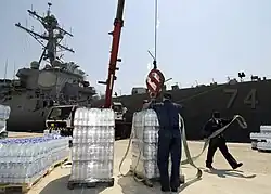 On 24 August 2008, McFaul arrived in Batumi, Georgia, as part of Operation Assured Delivery to "deliver humanitarian relief supplies ... as part of the larger United States response to the government of Georgia request for humanitarian assistance" in the wake of the 2008 Russo-Georgian war.[7] McFaul offloaded nearly 155,000 pounds (70,000 kg) of supplies—including hygiene items, baby food and care supplies, bottled water, and milk—donated by the United States Agency for International Development.[7][8]