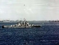 Japanese efforts to disrupt the landing culminated in the Battle of Leyte Gulf, an effort by three squadrons to attack the invasion fleet. After the American carrier task force was drawn north by a feint from the Northern Force, the main Japanese unit, the Center Force, attempted to penetrate the San Bernardino Strait. Miami remained with the carriers until the Center Force encountered a group of American escort carriers, destroyers, and destroyer escorts on the morning of 25 October. Frantic calls for support from the Fast Carrier Task Force led its commander, Admiral William Halsey Jr. to detach a group of ships, including Miami, south to stop the Center Force. By the time they arrived, the Japanese had broken off their attack, convinced they had stumbled into TF 38 itself. Miami and several cruisers and destroyers nevertheless caught and sank the destroyer Nowaki on 26 October.[4]