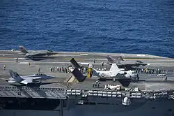 In late 2014, following the completion of work up qualifications, Nimitz participated in her first deployment, a two-week multi-national fleet exercise involving the Third Fleet, as well as ships from the Royal Canadian Navy and JMSDF.[48] Following the conclusion of the exercise, on 3 November the first F-35C Lightning II to land on an aircraft carrier recovered aboard Nimitz to begin a two-week Development Testing I deployment. This saw a pair of aircraft from VX-23 undertaking carrier operations of launch, recovery and handling aboard ship in both day and night conditions.[49][50] The initial deployment was completed on 14 November 2014.[51] In 2015, Nimitz transferred to Bremerton to undergo a 16-month maintenance cycle.[52]