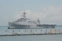 On 26 October 2011, Ponce began a three-week tour that would take her to Port Canaveral, Florida, the U.S. Virgin Islands, and her namesake city of Ponce, Puerto Rico. On her return to Norfolk, in December 2011, she was to begin the process of decommissioning.[13] On 2 December 2011, Ponce came home to await decommissioning, scheduled for 30 March 2012, when she would be towed to the Philadelphia Naval Shipyard,[14] and put in reserve status. In January 2012, in response to requests from United States Central Command, it was decided that she would be retrofitted and re-deployed as the first of a planned series of mine-countermeasures warships for use in keeping open strategic sea lanes.[15]