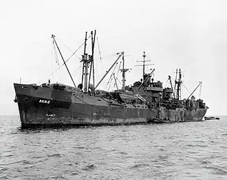 ![]() Sagittarius preparing to lower a Sea Mule over the side in April or May 1945 during the invasion of Okinawa | |