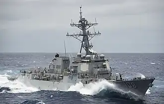 USS Wayne E. Meyer (DDG-108) is an Arleigh Burke-class (Flight IIA) Aegis guided missile destroyer in the United States Navy. She is named after Rear Admiral Wayne E. Meyer, known as the "Father of Aegis". She carries the 100th AEGIS Weapon System to be delivered to the United States Navy.[2]