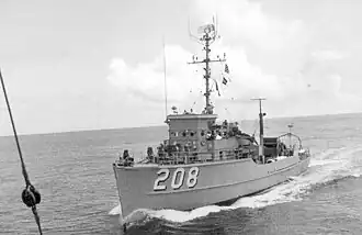 Over the next two years, Widgeon continued her operations in the Far East and Southeast Asian waters. During that time, she conducted two "Operation Market Time" patrols for which she later received the Meritorious Unit Commendation. The award, given the ship on 16 August 1970, was for the period from 1 June 1968 to 13 September 1969. During that time, Widgeon served with the Mine Countermeasures Ready Group and Coastal Surveillance Forces in combat operations off the coast of South Vietnam. She maintained a consistently high standard of readiness that enabled her to assume assigned duties early or on very short notice, and she completed three stints on "Operation Market Time" patrol stations. She not only inspected or boarded over 1,100 vessels but, on occasion, returned "hostile" fire from shore and conducted underwater searches. Throughout the repeated patrol extensions, "the continually outstanding performance, high state of morale, preparedness, and ingenuity of the officers and men of USS Widgeon attested to their exceptional team spirit and professionalism. By their exemplary courage and dedication, they contributed significantly to the success of anti-infiltration efforts in the Republic of Vietnam and enhanced the reputation of the Mine Countermeasures Ready Group, thereby reflecting credit upon themselves and the United States Naval Service."[2]